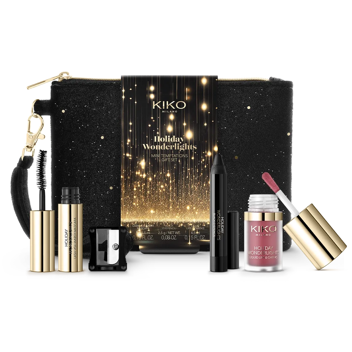 Conjunto de maquiagem para presente composto por uma máscara com efeito volumizador. um lápis de olho preto. um batom e um blush líquido em formato mini. dentro de uma requintada pochete.O conjunto contém:– No. 1 Mini Lash Volumizer MascaraTamanho mini e efeito maxi volume para esta máscara que realça os cílios e os envolve da base às pontas. mesmo em movimento.-N.º 1 Mini Black Eye pencilUm lápis chubby com uma textura cremosa ultrapreta para definir o formato dos olhos e intensificar o olhar que alia toda a praticidade de um tamanho compacto a um desempenho excelente. Afia-lápis incluído.-N.º 1 Mini Liquid Lips & CheeksUm delicioso produto 2 em 1. batom e blush líquido. para revestir os lábios de uma cor de efeito aveludado e iluminar o rosto. Versátil e muito confortável para usar em viagens.– No. 1 Mini Pochete para maquiagem e acessóriosPrática e elegante. é feita em tecido com efeito de veludo preto e decorada com uma cascata de detalhes dourados brilhantes. Formato retangular. fechamento em zíper e alça para o pulso.Ideal para:surpreender com um presente superprático e irresistível. Toda maquiagem para encantar com beleza. em formato mini. sempre à mão.