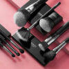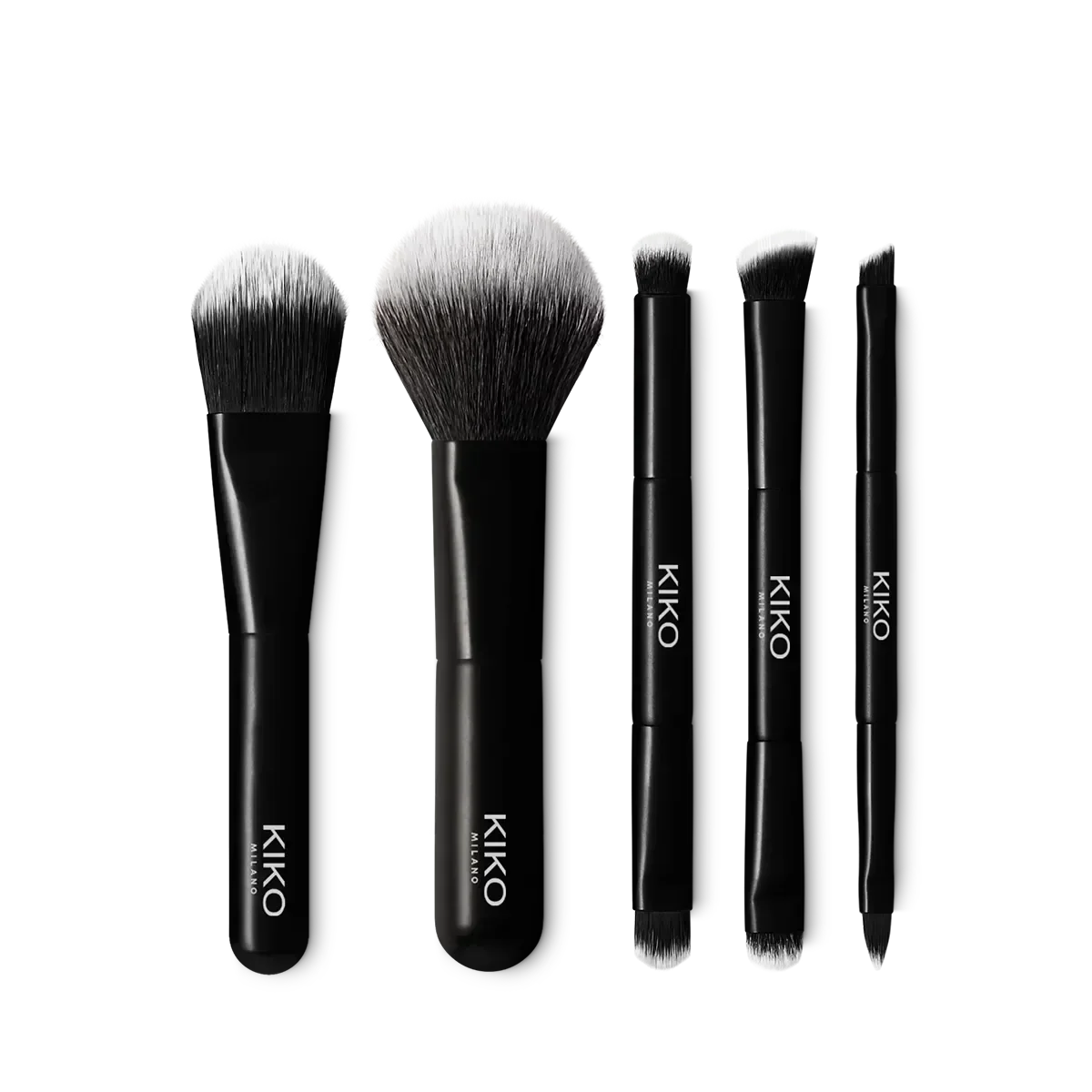 Prática pochete com design elegante com 5 acessórios profissionais: 2 pincéis mono e 3 pincéis duo para um total de 8 diferentes aplicadores específicos para a maquilhagem do rosto. olhos e lábios.