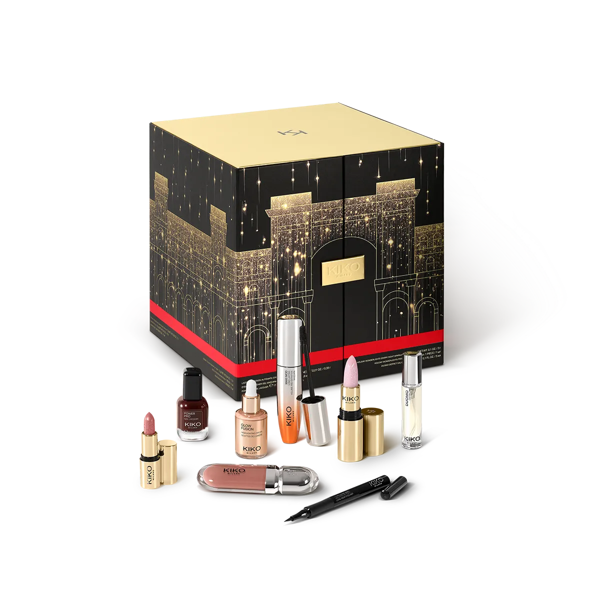 Inclui:– N.º 1 Sombra Holiday Wonderlights Metallic Magnitude Eyeshadow 01 – N.º 1 Batom líquido New Lasting Matte Veil Liquid Lip Colour 15– N.º 1 Verniz de unhas Power Pro Nail Lacquer 27– N.º 1 Lápis de olhos Unlimited Precision Automatic Eyeliner & Khol 16– N.º 1 Máscaras para contorno de olhos Nourishing Eye Patch– N.º 1 Lápis de olhos Colour Kajal 02– N.º 1 Esponja de mauqilhagem Holiday Wonderlights Precision Beauty Blender– N.º 1 Lápis de lábios Creamy Colour Comfort Lip Liner 08– N.º 1 Iluminador líquido Glow Fusion Highlighting Drops 02– N.º 1 Eyeliner em caneta Ultimate Pen Eyeliner 01– N.º 1 Brilho para os lábios 3D Hydra Lipgloss 20– N.º 1 Escova para o cabelo Holiday Wonderlights Hair Detangler– N.º 1 Bálsamo para os lábios Holiday Wonderlights Starlight Kiss Lip Balm– N.º 1 Máscara fixadora de sobrancelhas Eyebrow Designer Gel Mascara– N.º 1 Máscara para os lábios Holiday Wonderlights Brightening Kiss Lip Mask– N.º 1 Mini batom Holiday Wonderlights Mini Creamy Lipstick 02– N.º 1 Pincel para os olhos Eyes 52 Powder Shader Brush– N.º 1 Stick para contouring Holiday Wonderlights Bronze Signature Contouring Stick 01– N.º 1 Sérum para rosto Radiance Boost Serum Face Base– N.º 1 Eyeliner em caneta Holiday Wonderlights Twinkling Light Liquid Eyeliner– N.º 1 Batom Unlimited Stylo 21– N.º 1 Perfume Duomo District Mini Eau De Parfum– N.º 1 Máscara Maxi Mod Mascara– N.º 1 Batom Batom cintilante Holiday Wonderlights Starry Night 03Ideal para:Transformar a antecipação do Natal numa experiência de beleza única. O presente perfeito para estar rodeado de efeitos de luz encantadores todos os dias.